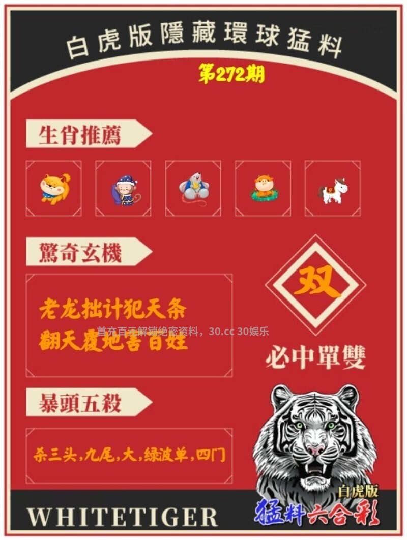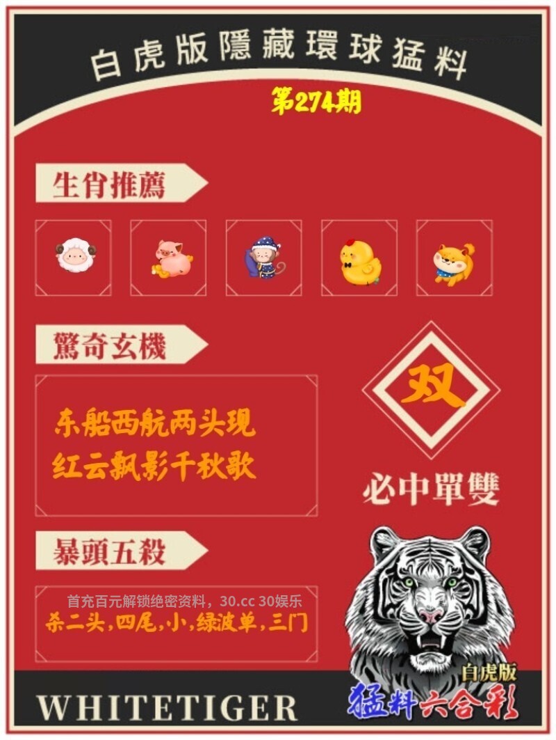 273期:白虎环球猛料 开:虎04对 一线忠义尽封尝,开国明君辨忠奸 解释:一线忠义尽封尝,开国明君辨忠奸,解蛇鸡鼠龙 九肖:蛇鸡鼠龙狗兔猴虎羊 |