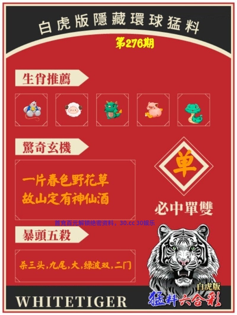 276期:白虎环球猛料 开:鸡09对 一片春色野花草,故山定有神仙酒 解释:一片春色野花草,故山定有神仙酒,解猴虎马兔 九肖:猴虎马兔鸡鼠羊猪牛 |